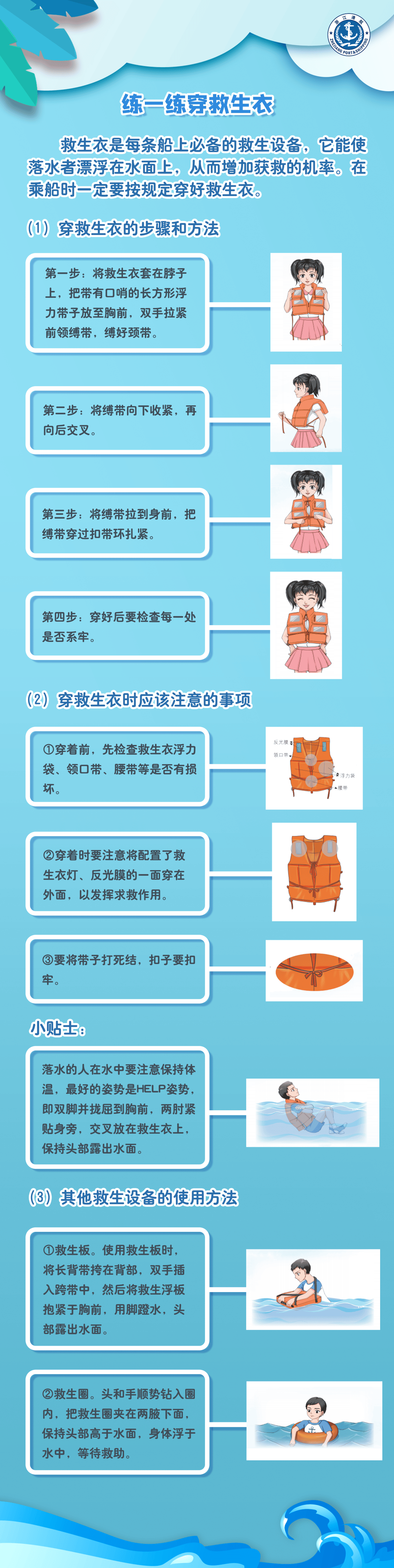 2、应尽量抓住水中的漂浮物,如救生衣、救生圈、救生板、木板、泡沫板等,利用它们的浮力求生。